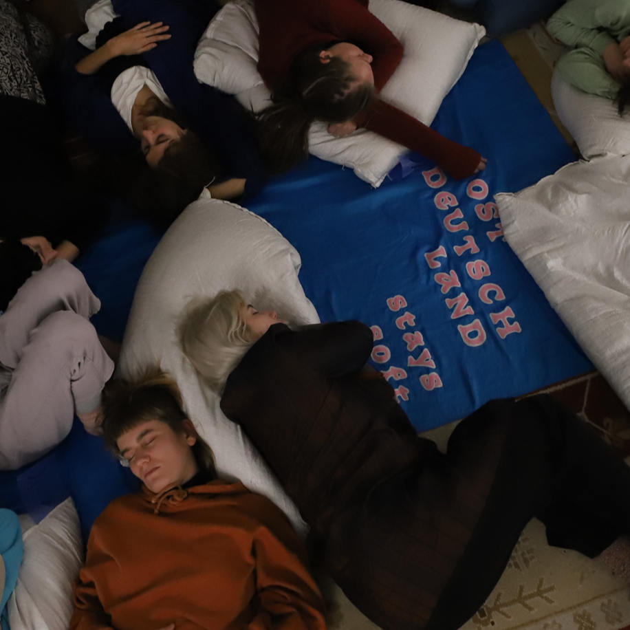 Vier Performer:innen und zwei Fotograf:innen fahren mit der Decke durch Ostdeutschland. Ihr seid eingeladen auf der Decke mit Ostdeutschen Personen, Pflanzen, Tieren, Maschinen, Gebäuden der Vergangenheit und Zukunft zu liegen, zu schlafen, zu träumen, zu hören, zu erzählen und zu atmen. Stickt mit uns an der großen, weichen Ostdeutschland Decke.
